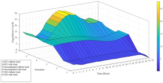 In Equation (10), battery degradation cost has been calculated based on the PEVs total battery degradation at each time for each scenario [