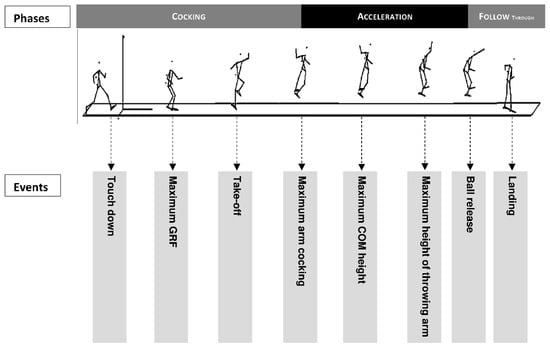 Jump throwing phases (cocking phase, acceleration phase, follow-through phase), and events (touch down, maximum ground reaction force (GRF), take-off, maximum arm cocking, maximum height of center of mass (COM), maximum height of throwing arm, ball release, and landing) during performance.