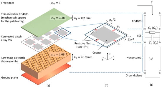 The base case absorber (Figure 2a) is composed of a resistive FSS mounted at a distance of approximately λ/4 from a copper ground plane. They are separated by a low mass dielectric substrate (Nomex Honeycomb) and the FSS is covered with a thin dielectric layer (RO4003C), which serves both as a mechanical support and as protection. The FSS is a periodic structure (Figure 2b) comprising rectangular metallic patches connected by resistive strips made of a TCR foil of 100 Ω/□.