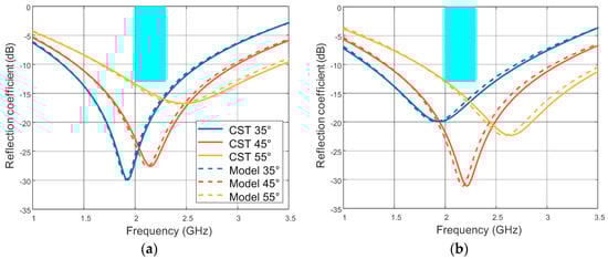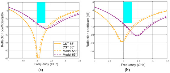 Similarly to what is observed for sector A, a good agreement between simulation and model is obtained. A maximum frequency shift of 50 MHz is observed for 65° in TE, which is probably due to the fact that the model does not take into account high order resonant modes of the FSS. As with sector A, we observe a scan and a mismatch effect, which limits the operational angular range of the design. For both polarizations, the resonance condition at 2.15 GHz is set at 60° (center of the targeted incidence range). For this frequency, is matched to at 55° for TE and to at 60° for TM. The absorber complies with the requirement of −13 dB between 2 GHz and 2.3 GHz (represented by a blue rectangle in the graph).