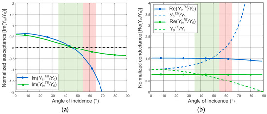 The real part of (Figure 4b) is relatively constant with respect to but needs to be matched with the admittance of the incoming wave, which varies according to Equations (1) and (2). This explains the second point, as when varies, this directly affects the mismatch according to Equations (3) and (4), resulting in a lower absorption level. Interestingly, the cancelling out condition is not chosen at resonance (40° for TE and 48° for TM instead of being at exactly 45°), which allows the widening of the frequency bandwidth at the expense of the minimum reflection level [20]. Similarly to what is observed for the imaginary part, the variation rate of and increases with . This is more pronounced for TM, for which for [0°, 35°], 0.5 for [35°, 55°], and 0.6 for [55°, 65°].