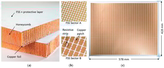 Two panels were realized for each sector. The two panels corresponding to sector A are shown in Figure 7a. The FSSs (Figure 7b) were realized by CIRETEC using two etching sequences. The copper foil and the FSS layer were then attached to the honeycomb using double-sided adhesive film for a total thickness of 41.1 mm. The total size of each prototype is 578 mm × 428 mm (Figure 7c) which is approximately at 2 GHz. For the sectorial absorber, two panels corresponding to sector A and a sector B were positioned side by side, resulting in a 1156 mm × 428 mm structure. The sectorial absorber composed of a panel A adjoined to a panel B is denoted by ‘A + B’ in the rest of the article. In order to compare the performances of the ‘A + B’ absorber with the uniform absorbers of the same dimensions, two other configurations were considered corresponding to panel A adjoined to a second panel A (denoted by ‘A + A’) and panel B adjoined to a second panel B (denoted by ‘B + B’).