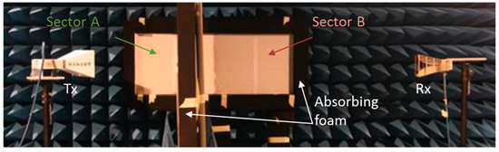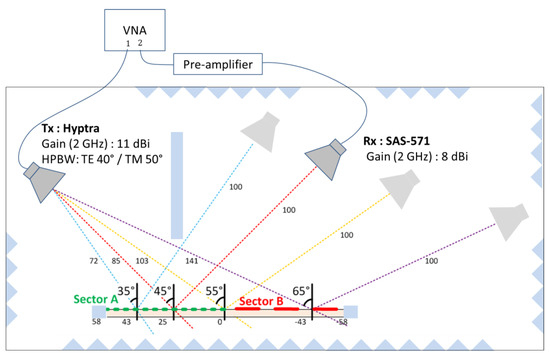 Measurements were performed in an anechoic chamber (Figure 9). Tx and Rx antennas were separated by absorbing foam to limit direct crosstalk. Additional foam was placed at the wedge of the sectorial absorbers to limit both the wedge diffraction and excitation of surface waves for oblique incidence. The measurements were performed using Keysight E5071C VNA and a pre-amplifier in reception. The transmitting antenna was the Hyptra horn antenna which has a gain of 11 dBi and a half power beam width (HPBW) of 40° and 50° for E and H planes at 2 GHz. The receiving antenna was the commercial SAS-571 horn antenna, which has a gain of 8 dBi at 2 GHz. The results were normalized with respect to a metallic plate of same size. In addition, time gating (Hann window) was applied to measured data in order to remove parasitic reflection from the setup.