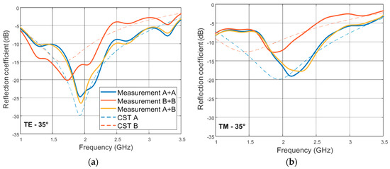 At 35° (Figure 10a,b), the dips are well marked and the result of sector A + B is very close to the one of the uniform sector A + A. As desired, sector A exhibits a better absorption than sector B for this angle. For TE, the frequency positions of the dips are in good agreement with simulations for both uniform absorbers. For TM, the absorption levels are well respected between simulation and measurement but the measurements are more selective and there is a frequency shift of approximately 250 MHz for uniform absorber A + A. The absorption band remains well positioned relatively to the [2 GHz, 2.3 GHz] objective.