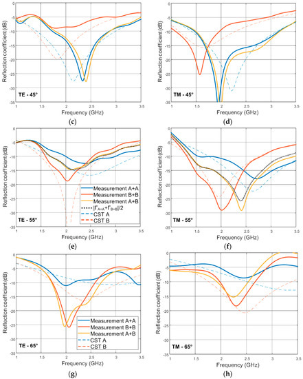At 55° (Figure 10e,f), the reflection point corresponds exactly to the transition between the two panels. For sector A + B, the backscattered signal is the complex average between the A and B contributions. For comparison, the average between reflection coefficients measured for sectors A + A and B + B () is also reported with the dotted black lines in the graph. For TE, there is a very good agreement between the average and the measurement of sector A + B. For TM, we also observe a good agreement between the average and the measured sector A + B. In this case, A and B are out of phase ( between A and B at 2.4 GHz from measurements) which contributes to shift the dip of A + B compared to either A or B. Note that this kind of destructive interference between the backscattered field from adjacent pavings has been exploited in recent years to design metallic-only absorbers [22]. For TE, the comparison between measurement and simulation is acceptable despite a deviation in the level of the reflection coefficient for both sectors A and B. For TM, we also observe a discrepancy concerning the level, but the resonant frequencies are well respected.