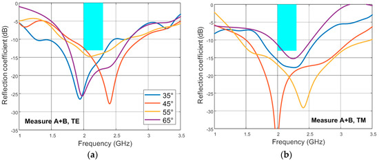 Finally, the reflection coefficient with respect to incident angle is represented at 2.15 GHz for sectors A and B and both polarizations in Figure 6. We observe that both sectors are operating in the targeted angular range. Sector A has a reflection coefficient inferior of −15 dB in [35°, 55°] and sector B, a reflection coefficient inferior of −17 dB in [55°–65°]. The sector A remains below −10 dB from normal incidence to 60°. It is interesting to note that in Figure 6, the absorption peaks with respect to angle are more selective for TM polarization than for TE, which is consistent with the angular sensitivity analysis made for Figure 4.