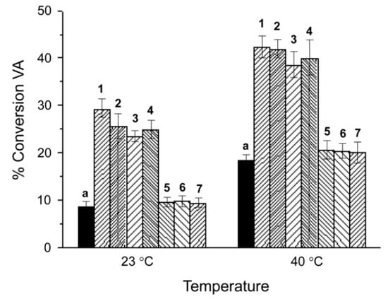 Conversion rates of veratrylalcohol (VA) to veratrylaldehyde (VAH) at 23 and 40 °C after 2 h without catalyst (a) and with catalysts (1–7); pH = 8.25.