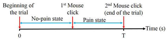 In this study, each subject was asked to sit on a comfortable chair at a distance of approximately 50 cm from a screen displaying a black image. The subjects were instructed to keep their eyes open during the experiments. At the beginning of each EEG recording trial, the subject was asked to relax his/her right hand on a table for 15 s. Then, the subject was instructed to submerge his/her right hand in a bucket of iced water with a temperature of approximately C until he/she starts to have a moderately uncomfortable feeling. The subject marks this moment by clicking the mouse button of the recording computer using his/her left hand. This mouse click indicates the end of the no-pain state and the beginning of the pain state. During the pain state, the subject keeps his/her hand submerged in the bucket of the iced water until the pain becomes intolerable. At this moment, the subject withdraws his/her right hand from the iced water and relaxes it on the table. The pain state ends when the subject feels that the pain has reduced to a moderate level by clicking the mouse button again to indicate the end of the trial and EEG recording. After each trial, the subject was asked to submerge his/her right hand in a bucket of warm water that had a temperature of C and countdown for 3 s starting from a random 4-digit number to ensure that each trial begins with the no-pain state [20]. The total number of trails recorded for each subject is five trials. Moreover, the average ± standard deviation duration of each trial computed over all subjects is s. Figure 1 shows the timing diagram of the experimental procedure during each trial.