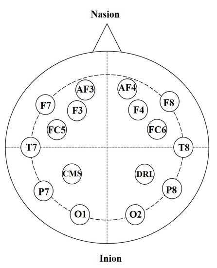 The EEG signals were recorded using the Emotiv EPOC+ EEG neuroheadset system (https://www.emotiv.com). The Emotiv system consists of 14 EEG electrodes that are arranged on the scalp according to the 10–20 international electrode placement system at the following locations; , , , , , , , , , , , , , and . These electrodes are referenced to the common mode sense (CMS)/ driven right leg (DRL) at the and locations. Figure 2 shows the positions of the EEG electrodes on the scalp. The acquired EEG signals are internally sampled at a frequency of 2048 Hz. Moreover, the Emotiv system is configured to filter the recorded EEG signals using a hardware band-pass filter with a bandwidth of 0.2 to 43 Hz and downsamples the EEG signals to 128 samples per second. Finally, the muscle and electrooculography artifacts within the EEG signals are reduced using the automatic artifact removal (AAR) toolbox [21,22].