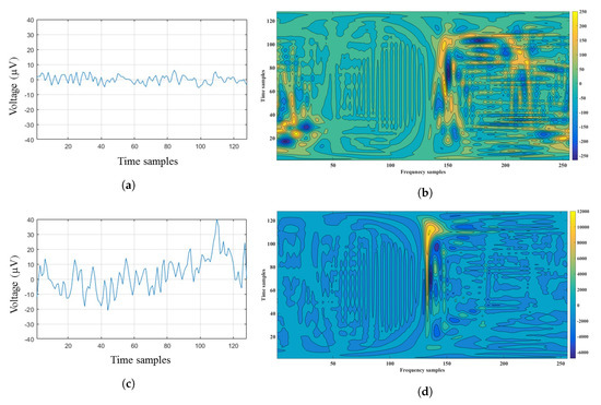 where is a smoothing parameter that determines the amount of suppression applied to the cross-terms introduced by the WVD and its value was experimentally tuned to be 0.7. In this work, we have utilized the HOSA toolbox [28] to compute the CWD of the EEG segments. The dimensionality of the CWD-based time-frequency representation (TFR) computed for each EEG segment, which is obtained using Equation (1), is equal to , where represents the number of time samples within an EEG segment and represents the number of frequency samples. Figure 3 provides sample images of the CWD-based TFR constructed for two different EEG segments. In particular, Figure 3a shows an EEG segment that belongs to the no-pain class. The CWD-based TFR constructed for the EEG segment presented in Figure 3a is shown in Figure 3b. Similarly, Figure 3c shows an EEG segment that belongs to the pain class. Figure 3d shows the CWD-based TFR constructed for the EEG segment presented in Figure 3c.
