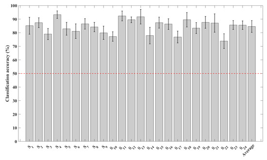 The average classification accuracy values computed for each subject over the ten train–test repetitions of the employed cross-validation procedure. The black vertical lines represent the standard deviations of the classification accuracy and the red dashed line represents the random classification rate. The last column represents the mean value of the average classification accuracies computed over the 24 subjects.