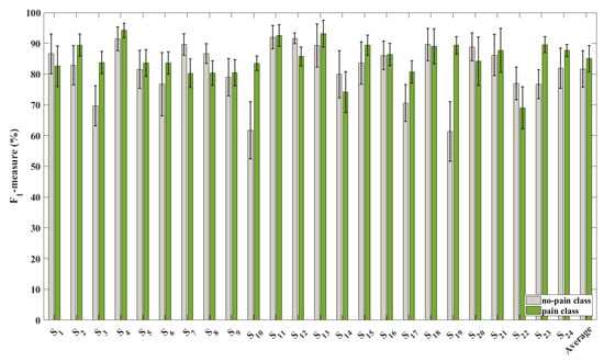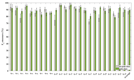 In this section, we present the results obtained for our proposed approach using all the EEG channels and all the CWD-based time-frequency features. The average ± standard deviations classification accuracies obtained for each one of the 24 subjects (–) are shown in Figure 4. In particular, the average classification accuracy values computed for the 24 subjects is between 73.8%, which was obtained for , and 93.3%, which was obtained for . Moreover, the average classification accuracy value obtained for each subject is significantly higher than the random classification rate, which is defined as the reciprocal of the number of classes, and equal to 50% (the red dashed line in Figure 4). The average ± standard deviation classification accuracy value achieved in distinguishing between the no-pain and pain classes, which is computed over all 24 subjects, is equal to . The average ± standard deviations of measure values computed for the no-pain and pain classes per each subject are provided in Figure 5. In particular, the average ± standard deviation measure values computed for the no-pain and pain classes over all subjects are and , respectively.