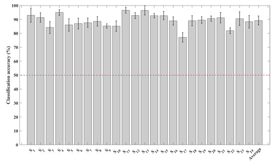 The average classification accuracy values computed for each subject over the ten train–test repetitions of the employed cross-validation procedure using the features , , and . The black vertical lines represent the standard deviations of the classification accuracy and the red dashed line represents the random classification rate. The last column represents the mean value of the average classification accuracies computed over the 24 subjects.