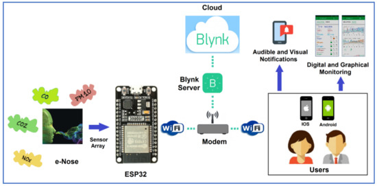 Today, cities face interesting challenges and problems to meet socio-economic development and quality of life goals, and the concept of “smart cities” responds to these challenges. The smart city is directly related to a strategy to reduce the problems caused by rapid urbanization [14]. The IoT is a network where physical objects are linked to each other or to larger systems. This network collects large amounts of data from different devices we use in our daily life and converts it into utilizable information [15]. The rapidly emerging IoT concept supports many different areas and applications including health, education, agriculture, industry and environmental monitoring. Real-time environmental monitoring and analysis is an important area of research for IoT [16]. IoT provides remarkable features to smart cities which improve environmental quality control, innovative real-life solutions and services. The smart home is an indispensable element of smart cities. In the future, smart homes will be fully managed through smartphone applications and will include IoT wearable devices [17] that are supported by microsensors. To date, several have been conducted in the literature with the aim of establishing real-time monitoring solutions for air quality analysis.