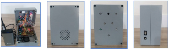 The images of the IoT-based e-nose system used in air quality measurements and formed from different sensors are displayed in Figure 2. The sensors used in the system are mounted in a 17 × 12 × 8 cm size sealed box per the measurement specifications. In addition to the sensors used for measurement, the box includes a printed circuit board, a fan for airflow to the dust sensor, and a power supply for the energy of the system.
