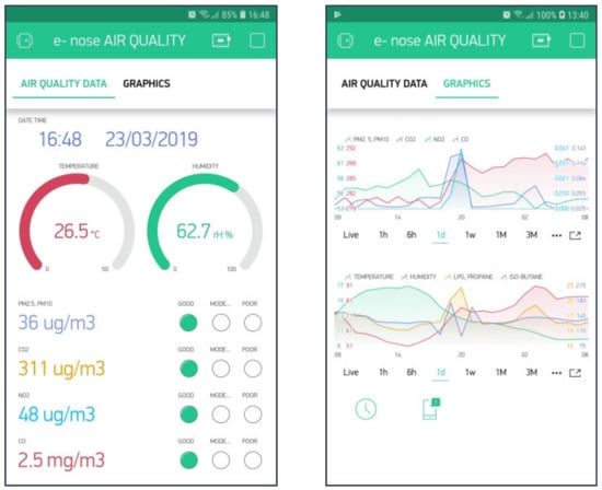 The climate parameters and gas concentrations are a median of 12 measurements taken at 5 s intervals. This minimizes the effect of erroneous measurements brought about by faulty sensors. Users are notified by exceeding the designated gas concentration and climate parameter thresholds. Five-minute averages are calculated and delivered to users as notifications, preventing false warnings that may mislead users. In this e-nose system which measures air quality, no memory element is used for data recording. The received data are recorded directly to the Blynk cloud server via the mobile interface. The data are sent to the registered e-mail address of the user when requested. The status of the internet connection is checked before each data transmission. When not connected, data packets that cannot be temporarily transmitted are stored to ensure data integrity, and then, when the internet connection is re-established, these packets are sent to the cloud server using past time tags. In this way, data loss can be prevented by providing continuity in the data flow.