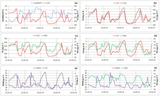 Relationship between gases during four-day measurement, (a) Humidity- CO2, (b) CO-CO2, (c) CO2- NO2, (d) CO-NO2, (e) PM10-CO, (f) CO-NO2.