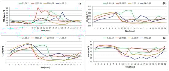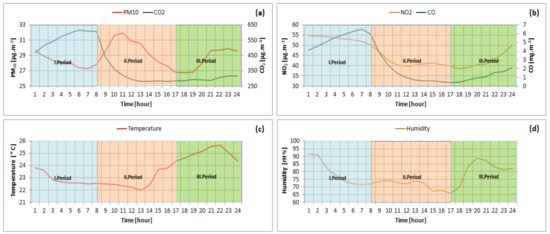 Figure 6 displays the daily changes of temperature, humidity, PM10, CO, CO2 and NO2 values. One-day time, period 1 (00:00–07:30), period 2 (07:30–16:30) and period 3 (16:30–00:00) are divided into three parts; period 1 sleeping of household inhabitants, period 2 during which the daily activities (cooking, cleaning, etc.) of the individuals in the household are performed, and the period 3 of eating and resting of the household inhabitants. The PM10 value seen in Figure 6a is in the order of 28.18 µg m−3, 29.93 µg m−3 and 28.40 µg m−3 for periods 1-3, respectively. It can be seen that PM10 has the lowest value in period 1 when the household is asleep. The CO2 values in the periods are as follows: period 1, 565 µg m−3; period 2, 317 µg m−3; and period 3 has a mean value of 297 µg m−3. The value of CO2 reaches the highest value in period 1 when the household inhabitants are asleep.