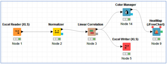 The correlation relationships between air quality dates have been estimated by the Konstanz Information Miner (KNIME) “Linear Correlation” algorithms. Figure 8 shows the linear correlation workflow of KNIME.