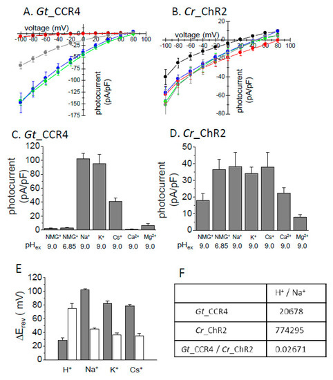 It was already reported that Gt_CCRs are H+- and Na+-permeable cation channels [29,30]. We here investigated the cation selectivity of Gt_CCR4 in more detail relative to Cr_ChR2. Ionic conditions of the extracellular solution were systematically exchanged with various cations including Na+, K+, Cs+, Ca2+, Mg2+ and NMG. In the presence of NMG, one can assume H+ as the permeated ion. Figure 2A,B show the I-V plot of Gt_CCR4 and Cr_ChR2 under several ionic conditions. Obviously, the reversal potential shift in Na+ solution is larger in Gt_CCR4 than in Cr_ChR2, suggesting that Gt_CCR4 is more permeable to Na+ than Cr_ChR2. Notably, I-V plots of Gt_CCR4 at pH 6.85 and 9.0 in NMG are almost identical (Figure 2A) whereas a large shift of reversal potential was observed in Cr_ChR2 under the same conditions (Figure 2B). These results indicate that Gt_CCR4 has less H+ selectivity than Cr_ChR2. The photocurrent amplitude of Gt_CCR4 and Cr_ChR2 at −60 mV under each condition is summarized in Figure 2C,D. The current amplitude of Gt_CCR4 was significantly larger in the presence of Na+ and K+ close to −100 pA/pF and in the presence of Cs+ at about −40 pA/pF. In contrast, only a negligible current was observed at low pH, or in the presence of Ca2+ or Mg2+. This supports the notion that Gt_CCR4 is more of a monovalent metal cation selective channel. In addition, we also tested measurements under a competitive environment in which both Na+ and Ca2+ were both added to bath solutions (Figure S1). Interestingly, photocurrents by Gt_CCR4 were suppressed at a higher Ca2+ concentration (40 mM), suggesting that Na+ flow is blocked by Ca2+. In contrast, such a large difference in current amplitude was not observed under various conditions in the photocurrent from Cr_ChR2 (Figure 2D). This is due to low ion selectivity in Cr_ChR2 as was reported previously. To assume the selectivity ratio, the reversal potential shift from the condition with NMG at pH 9.0 is depicted in Figure 2E. The shifts (ΔErev) in Gt_CCR4 are larger than in Cr_ChR2 for Na+, K+, and Cs+ indicating that Gt_CCR4 is selective for monovalent cations but less selective for H+. In the initial study of Cr_ChR2, the permeability ratio was calculated based on the current amplitude [8]. The table in Figure 2F summarizes the ratio both for Gt_CCR4 and Cr_ChR2. H+ permeability for Cr_ChR2 is 0.77 × 105, close to the reported value (1 × 106), while that for Gt_CCR4 is 2.1 × 104, indicating about 37-fold less permeability for H+ in Gt_CCR4.