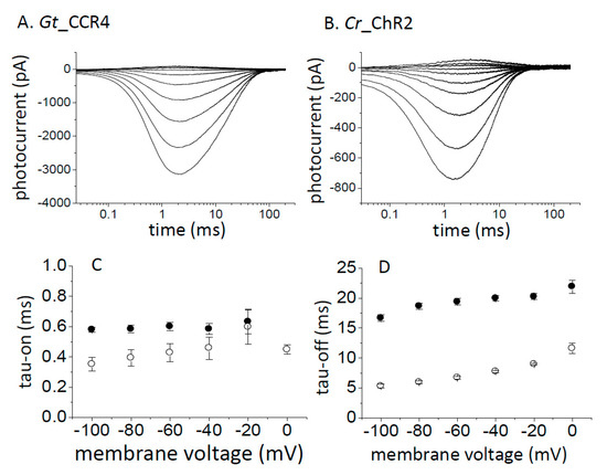 Flash laser stimulation. Standard solutions were used. Each channelrhodopsin in ND7/23 cells was stimulated by 5 ns by a green flash laser. Representative trace generated by Gt_CCR4 (A) and Cr_ChR2 (B) in 20 mV steps from −100 mV to +80 mV. (C) τon-voltage relationship from Gt_CCR4 (filled circle) and Cr_ChR2 (empty circle). Current rise was fitted by a single exponential function. The time constant was plotted. (D) τoff-voltage relationship from Gt_CCR4 (filled circle) and Cr_ChR2 (empty circle). Current decay was fitted by a single exponential function. (n = 5–7 cells).