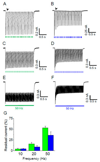 High frequency stimulation of Gt_CCR4 and Cr_ChR2. (A,C,E) Gt_CCR4 in ND7/23 cells was stimulated by green LED light with a frequency of 10, 20 or 50 Hz as indicated by colored dots or a line under each trace. Membrane voltage was clamped at −60 mV. (B,D,F) Similarly, Cr_ChR2 was stimulated by blue LED light with a frequency of 10, 20 or 50 Hz as indicated by colored dots or a line under each trace. (G) Residual tail current at three different light frequencies is summarized. Residual tail current is the current amplitude right before the next photo stimulation indicated by an arrowhead in A,B. The current value was normalized to the peak amplitude as 100%. A standard solution was used. (n = 3 cells).