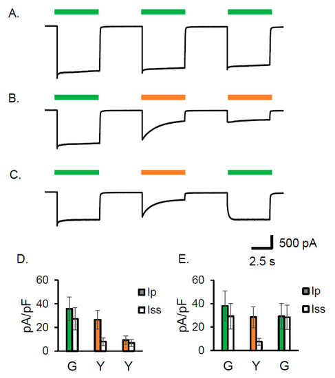 Gt_CCR4 is inactivated by light with a longer wavelength. Standard solutions were used. Membrane voltage was clamped at −60 mV. Photocurrent by 530 nm light (7.44 mW/mm2) in (A) reached a steady state level after transient peak current. Repetitive stimulations gave almost identical current shapes. (B) Slow inactivation of the photocurrent was observed by illumination with 590 nm light (7.44 mW/mm2). The current was further reduced when illuminated twice with 590 nm light. (C) After 590 nm inactivation, 530 nm light fully reactivated the photocurrent to the original steady state level. (D) Photocurrent density from the measurement shown in (B). The photocurrent density upon exposure to the first 530 nm light (shown in G), and the second and third 590 nm light (Y), is shown. Ip; transient peak component. Iss; steady state component. (E) Photocurrent density from the measurement shown in C. The photocurrent density upon exposure to the first 530 nm light (shown in G), the second 590 nm light (Y), and the third 530 nm light (shown in G), is shown. (n = 4 cells).