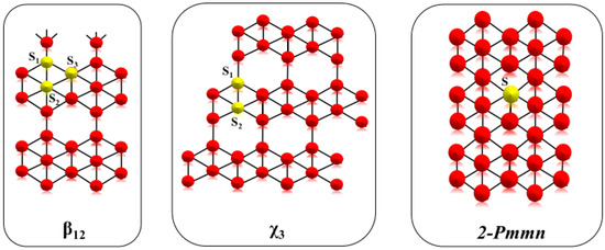 Crystal structures of β12, χ3 and 2-Pmmn.