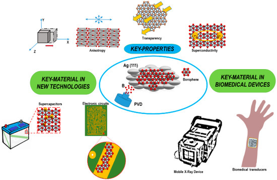 Growing scientific evidence has pointed out that borophene has many overlapping attributes with graphene; their mechanical and chemical characteristics are so similar to be easily comparable, even at a nanometric scale. The similarities with graphene, together with the numerous properties and potential applications previously reported, make borophene a promising 2D allotropic material for biomedical devices (Figure 5).