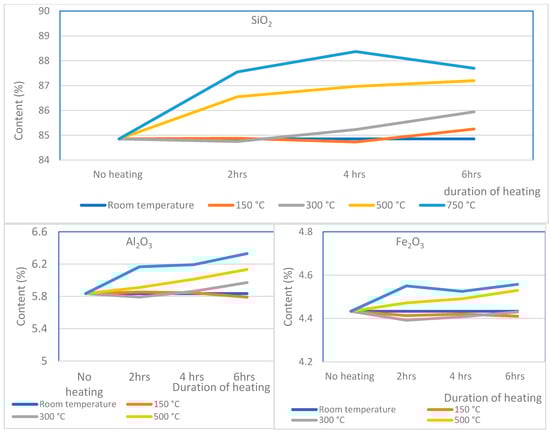 Changes in soil SiO2, Al2O3, and Fe2O3 content with increase in temperature and duration of heating.