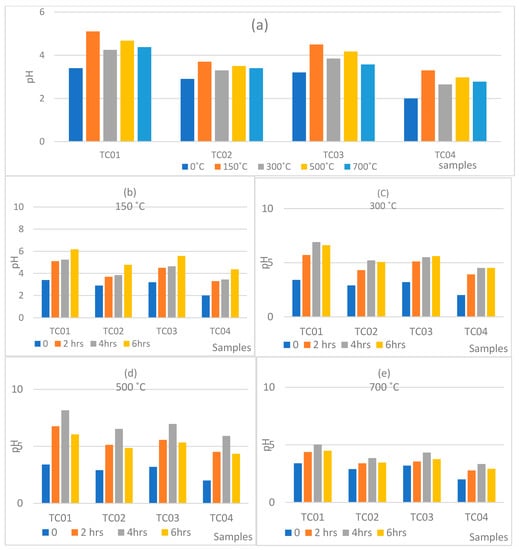 Reports of the effects of fire on soil pH are contradictory. Whereas fire-induced increase in soil pH has been reported by Arocena and Opio [16], Certini [26], Badía and Martí [49], and other researchers [70,71,72,73] have shown that heating between 250 and 500 °C lowers soil pH. Most of the studies which reported a decrease in pH were, however, carried out in the lab, which does not take into consideration the effect of the ashes produced from burning plant residues in the soil, hence the observed decrease in soil pH in some studies. However, laboratory studies carried out on contaminated soil in South Africa show that soil pH increases with increase in temperature up to 150 °C, after which there is no obvious effect of fire on soil pH (Figure 3a) [44]. These changes were observed after up to about 4 h of heating at various temperatures (Figure 3b–e). The values obtained in this study are similar to those reported by Arocena and Opio [16] in burnt soils. These results highlight the role of fire intensity and duration on the changes in soil pH observed during fire events. Combustion of organic matter and ash production which releases large quantities of base forming ions calcium (Ca), magnesium (Mg) and potassium (K) during burning is the main explanation used to justify the increase in pH values observed with increase in fire intensity and duration. Granged et al. [72], Arocena and Opio [16], and Úbeda et al. [74] have all shown that changes in soil pH caused by fires only last for about 3 years though Etiégni and Campbell [75] reported up to 50 years.