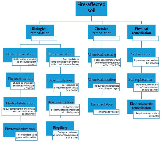 Not all soil remediation technologies could be used on fire-affected soils. Based on the available literature, some physical, chemical and biological remediation technologies that could be used on such soil, and the conditions under which they could be used, are presented in Figure 5. For each of these methods, certain conditions need to be met to achieve any level of success. High water repellency, low cation exchange capacity, and prevailing high pH are some of the conditions in fire-affected soils which impinge on the success of these remediation technologies.