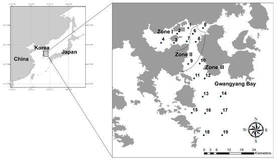 Gwangyang Bay is part of the Korean National Archipelagos located off the south coast of the Korean peninsula (Figure 1). The bay receives an annual mean discharge of 2298 × 106 m3 yr−1 from the Seomjin River [26]. A significant amount of nutrients drains into the system from the watershed (~5000 km2). The water depth varies from 10 m at the Seomjin River estuary to 50 m at the outer Gwangyang Bay. The tidal cycle appears to be semi-diurnal. Compared to other Korean river estuaries which have barriers, the Seomjin River estuary remains open, and thus the water mass is exchanged between the river and ocean more actively. The natural condition of Gwangyang Bay is apt to increase primary productivity as well as biological diversity. In this respect, Gwangyang Bay (~450 km2 from the estuary to the outer bay) is the most economically productive coastal ecosystem in the Korean peninsula [25].