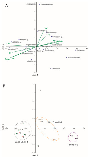 Canonical correspondence analysis (CCA) used to evaluate (A) the relationships between abundance of operational taxonomic units (OTUs) sequences (based on genus level identification) and environmental factors (temperature (Temp.), Salinity, total phosphorus (TP), total nitrogen (TN), chlorophyll-a (Chl-a), total organic carbon (TOC), total inorganic carbon (TIC), total carbon (TO), elemental carbon (EC)). (B) Sites grouping based on CCA analysis.
