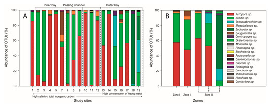 Abundance of OTU sequences along the study sites (A) with site description of physical features and zone classification (B) based on genus identification level.