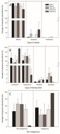 When divided into categories (habitat types, trophic level, and ISR), averages of abundant sequences showed different patterns among the zones (I, II, III-1-2-3). The most dominant habitat type of OTU was the marine type for the three different zones (Figure 4A), while the types of feeding habit and indigenous rate showed complex response patterns. The dominant trophic level was first consumer and second consumer, followed by producer and symbiotic trophic levels (Figure 4B). The indigenous rate of Zone III-3 was significantly higher than other zones, but Zones II and III-1 showed opposite patterns (Figure 4C), while Zones I and III-2 presented no significant difference in indigenous rates. The three divisions of Zone III from CCA results demonstrated similar patterns within the three zone types (Zones I, II-and III).