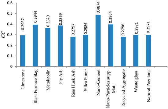 The distance of each concrete siliceous material to the FPIRP and FNIRP can be calculated using Equations (10) and (11). Once the distances of concrete siliceous material from FPIRP and FNIRP are determined, the closeness coefficient for the concrete siliceous material alternatives can be obtained with Equation (12). Closeness coefficients are calculated based on the obtained FPIRP and FNIRP. The distances of concrete siliceous material from FPIRP and FNIRP, the closeness coefficient and ranking of various concrete siliceous materials are shown in Table 6. Figure 2 depicts the graphical representation of concrete siliceous materials ranking as per the obtained Closeness Coefficients.