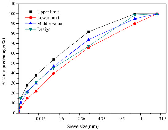Under the premise of fully considering the residual porosity and other factors, the coarse and fine aggregates should be sandstone/limestone with a continuous grading, and the grading was artificially compounded through experiment. The accumulated screening rates are demonstrated in Figure 1, where the upper and lower limits refer to the technical specifications of JTG F30-2003 [23].