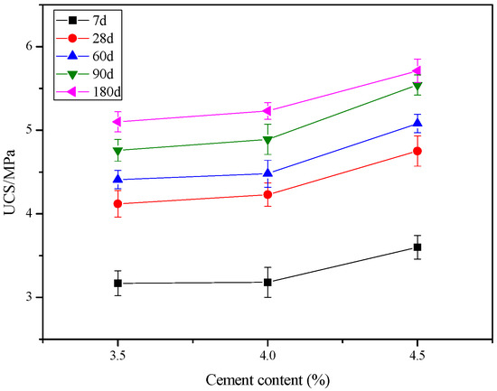 It is widely known that the cement used in CSM can effectively improve the adhesion level and mechanical properties of the mixtures. The effect of cement content on the UCS is displayed in Figure 3. The overall trend is a rise in the UCS value of the SCSM as the cement content increases, which is because the enhanced effect of cement on the strength of the material and the bonding force between the particles is enhanced by the increase in hydrated products as expected [26]. In addition, based on the slope of the curve, it can be seen that at the same age, the increase rate of the UCS is very low when the cement content adds from 3.5 to 4.0%, but the growth rate becomes significantly higher as the cement content increases from 4.0 to 4.5%. For instance, when the cement content increases from 3.5 to 4.0% at 60 days of curing, the strength of the SCSM rises by approximately 0.07 MPa, and the increase from 4.0 to 4.5% results in an approximate 0.6 MPa rise. However, the experimental results of Farhan et al. [26] show that the development rate of the UCS of a traditional CSM is almost proportional to the cement content. The reason for the above difference may be the large porosity of the sandstone. On the other hand, the strength of the SCSM with the highest cement content in the research range is still lower than those of the source rocks, which indicates that the main reason for the failure of the test piece may not the devastation of the aggregate. Usually, the initial micro-cracks of an aggregate concrete appear in the interfacial transition zone [27]. Therefore, the failure of the CSM may be caused by the low degree of bonding between the aggregate and mortar.