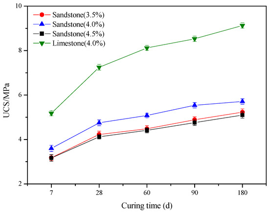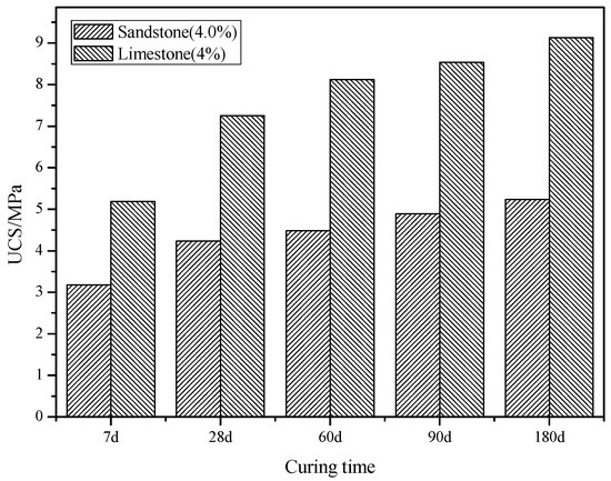 It is well known that the UCS of CSM is closely related to the aggregate strength in the mixture. Mixtures of sandstone A and limestone with a cement content of 4.0% were tested. It can be observed from Figure 4 that the compressive strength of the SCSM mixture is lower than the compressive strength of the CSM mixture for the same curing period. The UCS of the limestone sample is approximately twice that of the sandstone sample; correspondingly, the compressive strength of the limestone parent rock is 2.0 times that of the sandstone A parent rock. This finding means that the characteristics of the parent rock, including its chemical composition and physical mechanics, are significant factors influencing the UCS of the CSM with this rock as the aggregate. Meanwhile, the strength of the SCSM is lower than that of the CSM, which may be because the dust attached to the surface of the sandstone weakens its bond with the cement slurry.