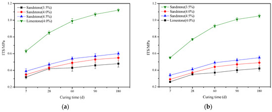 Relationship between the ITS and curing time. (a) Dry state (b) Water-saturated stat.