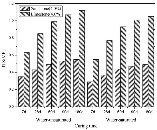 The tensile strength of the mixture was determined by the ITS test at the time of failure to evaluate the ability of the CSM to resist cracking [31]. Table 4 shows the ITS values of the SCSM with different cement contents and CSM with cement content of 4% at ages of 7, 28, 60, 90 and 180 days in water-saturated and dry situations. It was observed from Figure 6 that the values of ITS increased proportionately with the increase in the amount of cement and the curing time, whether under dry or water-saturated conditions. In fact, the mechanisms of the effects of cement content and curing age on the ITS are similar to those of the UCS. In addition, it can be observed in Figure 7 that the CSM exhibited much higher ITS than the SCSM for the same cement content at 7, 28, 60, 90 and 180 days. The reason for this phenomenon is most likely because the crushing value of the sandstone parent rock is significantly higher than that of the limestone, which can be seen in Section 2.1.2. Different from the UCS, the ITS is mainly affected by the interfacial bonding in the CSM between the cement mixture and lightweight aggregate particles [32]. This phenomenon may also be due to the high clay content of the sandstone, which is present in the form of fine aggregates or encased on the surface of the mixture, thereby significantly delaying the hydration of the Portland cement. This not only weakens the cohesion between the aggregate and the cement but also affects the ITS of the CSM. According to JTG D50-2017, the ITS of the CSM mixture base should be between 0.4 and 0.6 MPa at 90 days of age. It can be observed from the test results that if sandstone is used instead of a natural aggregate, the ITS values are higher than the criterion for cement stabilized base materials of the standard.