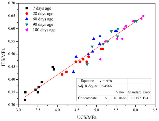 The fitting curve of the UCS and ITS values for SCSM and CSM blends in different curing periods is shown in Figure 8, from which it can be inferred that the ITS value is about 10% of the UCS value, which is suitable for total examined blends at different ages. The phenomenon represents there is a unique connection between the UCS and ITS, regardless of the composition of the mixture (aggregate type, cement content and curing age). In general, the tensile strength of ordinary concrete is 1/10 to 1/20 of its compressive strength. In the study of [34], for different natural aggregate mixtures with the disparate amount of cement, the results indicated that there was a linear relation, namely, . Thus, the current test results have been proven to be reasonable.