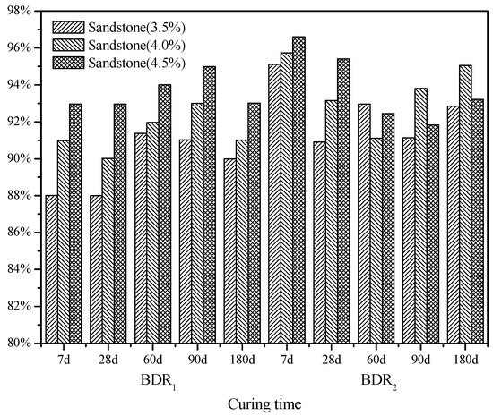 The water stability is one of the factors considered in the study of the pavement material properties. The softening coefficient is an important indicator for characterizing a CSM. This coefficient reflects the ability of a mixture to resist water damage and has distinct influence on materials with high water absorption and porosity levels. Considering the high water absorption and porosity of the sandstone, the test pieces of each curing age were subjected to water immersion treatments, and the test pieces in the saturated and dry states were tested according to the above experimental methods. Then, the softening coefficient was calculated according to Formula (2):