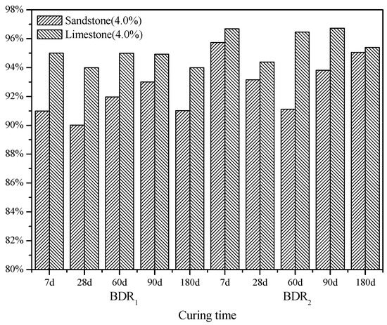 In northern Shaanxi, the climate is characterized by cold and long winters. After repeated freeze-thaw cycles during the winter and early spring thawing, the semi-rigid base layer is susceptible to freeze-thaw failure, resulting in melt settling and frost heave. The frost heaving action of the pore water in the semi-rigid base material damages the cementing action between the particles, which is the cause of the instability of the mixture caused by freeze-thaw action. As a type of sedimentary rock, sandstone has lower mechanical properties and higher water absorption and porosity levels than those of limestone. Therefore, the frosting process (freeze-thaw cycles) that can destroy CSM is a significant problem. The anti-frost property of the material is characterized by BDR1 and BDR2 to determine the amplitude range of the mechanical properties of the cement stabilized substrate in cold weather conditions. The results of the different frost resistance indexes before and after freezing and thawing cycles are summarized in Figure 9 and Figure 10. All frost resistance indexes are lower than 100%, which indicates that the freezing and thawing effect can cause the attenuation of strength. During the frosting process, the pore water of the mixture gradually freezes in the capillary chamber, creating a water pressure as frozen water bulk increases. As shown in Figure 9, the lower the cement incorporation is, the greater the intensity attenuation of the SCSM. For instance, when the cement content is 4.5%, both the UCS and ITS are attenuated by approximately 5%. However, the attenuation amplitude approaches 11% with a cement content of 3.5%. The reason for the faster deterioration of the mechanical properties of the mixture at a lower cement dosage is the cementation is the main factor of the adhesive property of the mixture. In the study of the antifreeze properties of other types of CSM bases, the experimental results showed that the cement content is an important factor affecting the antifreeze performance similarly [35,36]. Therefore, to increase the frost resistance of the SCSM mixture, increasing the cement content appropriately is an effective method. In addition, Figure 10 shows that the attenuation of the SCSM is significantly higher than that of the CSM. Compared with porous cement stabilized macadam, the strength loss of SCSM after freeze-thaw cycles is relatively smaller, which confirms the frost resistance is affected by the porosity of the material, its internal moisture and the environmental conditions. Therefore, the poor freezing resistance of the SCSM mixture is due to its high porosity and water absorption level.