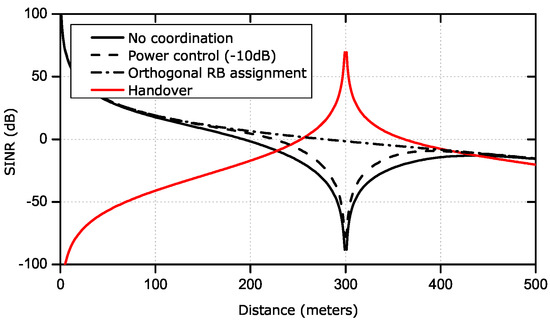 As briefly reviewed below in this section, there have been numerous research efforts to tackle this problem based on radio resource coordination; these approaches can be classified into orthogonal resource block (RB) assignment (a resource block (RB) is a group of subcarriers and also the minimum scheduling granule in OFDMA systems; for example, in 3GPP Long-Term Evolution (LTE), 12 contiguous subcarriers compose an RB (5 RBs in a 900 kHz band)), power control or combinations thereof. Figure 1 compares the achieved DL SINR of a macrocell user under different approaches, showing that radio resource coordination can mitigate the interference problem to some degree. As a macrocell user passes by a femto BS located 300 m away, his SINR gets deteriorated considerably. To protect the nearby macrocell users’ communications, the femto BS can reduce its transmitting power (power control) or use a different RB from that allocated to the macrocell user (orthogonal RB assignment). However, both approaches, if operated dynamically, require the detailed (e.g., per-RB) and real-time information of the macrocell’s resource usage, and, moreover, their achievable gain is limited.