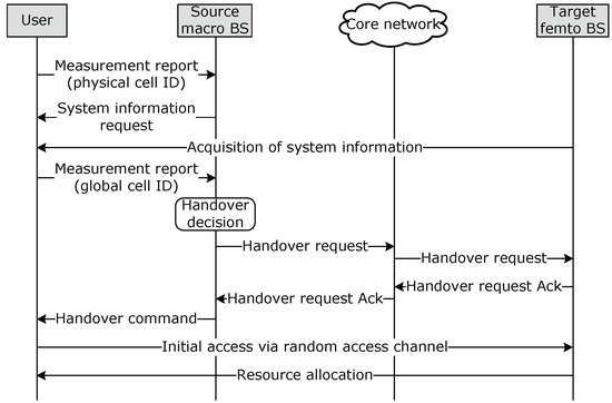 Figure 2 illustrates the procedure of a macrocell-to-femtocell handover considered in this paper, which is analogous to that of 5G NR [23]. A user measures the pilot signal strength of neighbor cells and reports the measurement to his serving macrocell according to the rules set by the system information (SI). If a target femtocell is not uniquely identified due to physical cell ID confusion (due to the typical cell size of femtocells being much smaller than macrocells, there can be multiple femtocells within the coverage of the source macrocell that have the same physical cell ID, which leads to a condition referred to as physical cell ID confusion, where the source macrocell is unable to determine the correct target femtocell for handover [24]), the macrocell requests the user to report the femtocell’s global cell ID by acquiring the SI of the femtocell. This operation requires the user to suspend reception and transmission with the source macrocell for a certain time duration, thus degrading the user’s performance. Based on a new measurement report, the source macro BS makes a handover decision and sends a handover request to the target femtocell. Upon reception of the acknowledgment (Ack) for the handover request from the femtocell, the macro BS transmits a handover command to the user, which triggers his service interruption immediately. The user accesses the target femtocell via a random access channel and gets allocated new radio resources from it. This implies the user experiences a performance loss due to a handover, which is further aggravated by the additional SI acquisition step.