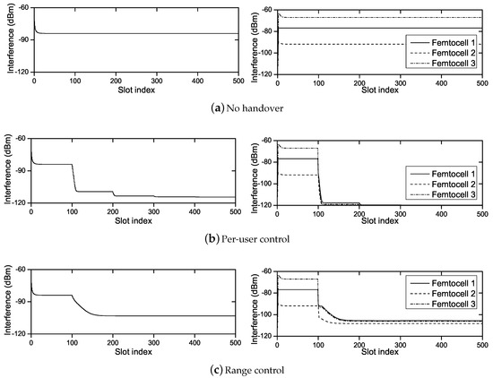 Figure 4 shows the sample-time evolutions of the UL interference at the macrocell and three example femtocells: (a) without handover; (b) with per-user handover control (HO-FIM); and (c) with range control. Thirty macrocell users and thirty femtocells are distributed in the macrocell. The target SINR of macrocell users is set to dB while that of femtocell users is 5 dB (it is assumed that indoor femtocell users tend to use data-centric services requiring a higher data-rate). As shown in Figure 4, without handover, the macrocell’s interference is dBm. When the per-user handover control is applied, however, a significant reduction of the interference is obtained every 100 slots (i.e., when handovers are triggered), and the macrocell’s interference converges to dBm. The range control also results in a considerably reduced interference ( dBm), but the achieved gain is smaller than the per-user control due to the reduced optimality, as explained above. Figure 4a reveals that the UL interference at some femtocells (depending on the presence of a nearby macrocell or femtocell user) could be serious ( dBm at Femtocell 3). With HO-FIM, a similar result is observed for femtocells, i.e., convergence of the interferences at femtocells to significantly reduced levels.