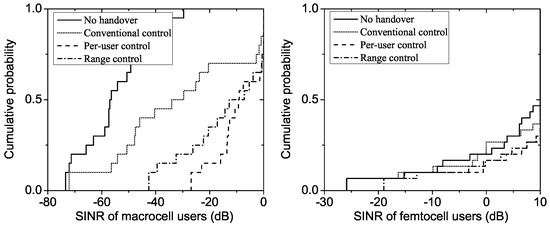 Probability distribution of users’ achieved SINRs under various numbers of macrocell and femtocell users when the range control is considered (the target SINR of macrocell users and that of femtocell users are dB and 5 dB, respectively).