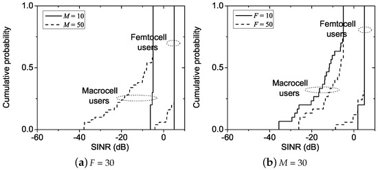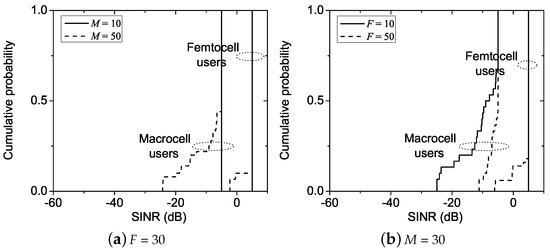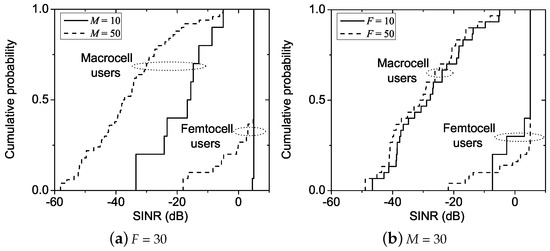 Next, the effect of the target SINR is studied. The corresponding simulation results are plotted in Figure 9 when M = 30 and F = 30. According to the considered power control mechanism described in Equation (4), the transmitting power of a user is proportional to his target SINR. Thus, it is clear that a higher target SINR will generate a larger interference and thus degrade the performance of the users having insufficient room to increase their transmit power. However, a change in macrocell users’ target SINR and a change in femtocell users do not result in the same level of performance degradation. When the target SINR of macrocell users is changed from dB to 0 dB, some macrocell users achieve better SINRs (due to the increased target SINR) and others achieve lower ones, but femtocell users are unaffected. This is because macrocell users are likely to experience larger path losses to their serving cells (either macro- or femtocells) than femtocell users and thus, they are less robust against interference.